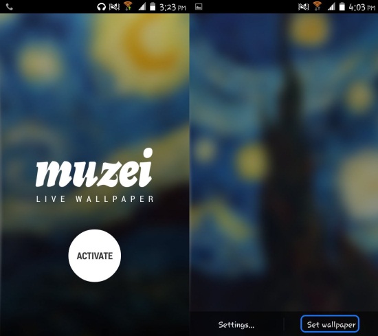 You can get this Muzei live wallpaper for Android from the link at the end of the article. After installation, just open it up and you will have the interface as shown below. Click on activate, and you will have the app window as seen in the second screenshot. Click on set wallpaper to set Muzei live wallpaper as your background.