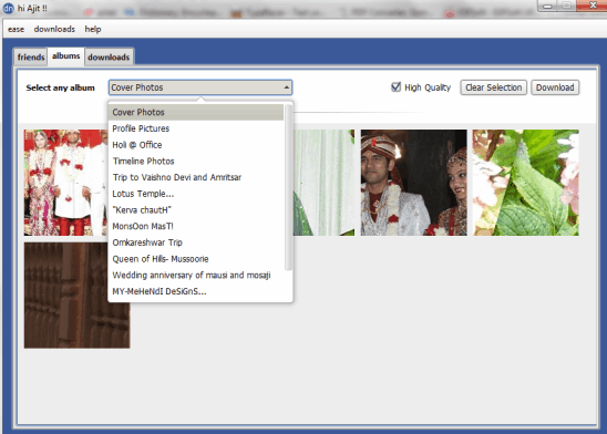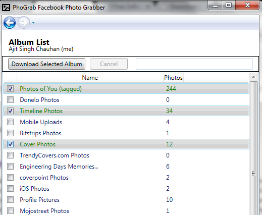 Facebook Photo Grabber is another handy software to download Facebook albums. You can download your photo albums, tagged photos, as well as your friends’ albums. It also comes with unique feature to download the liked pages (Facebook pages liked by you). On its simple interface, it provides a list of your friends’ name and you can select any friend to explore his/her albums. After that, list of all albums will be available to you. From that list, you can select albums to download. What makes it more interesting to use is that all albums are downloaded with their original album name. Hence, you won’t find any difficulty to search for a particular album after download. The missing part in this software is that photo preview option is not available. But it does its work perfectly.