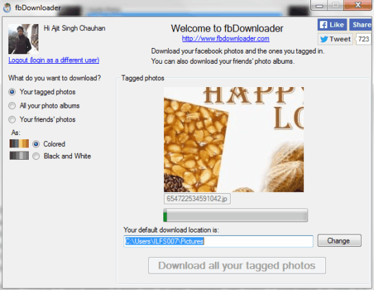 fbDownloader is an interesting Facebook photo downloader that comes with unique black and white filter feature. Using this feature, all your photos and albums will be downloaded in grey color only. But you can even download photos in original color. Using this software, you can download all your tagged photos, photo albums, and friends’ photos. In friends’ photos section, you can first select a particular friend, and can see his/her albums. After that, it will be your choice which album you want to download. This is a handy feature as you don’t have to download all albums.