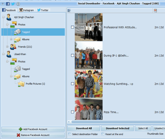Social Downloader is the best Facebook photos and albums downloader software available in this list. Speciality of this software is that it lets you add multiple Facebook accounts. After adding those accounts, you can explore any account’s albums and photos. It comes with a beautiful interface and provides a navigation pane to explore albums. You can download your own albums, tagged photos, and any friend’s photos. Either all photos can be downloaded to your selected destination location, or you can select which photos you want to download. It also comes with thumbnail feature to preview the images before downloading.