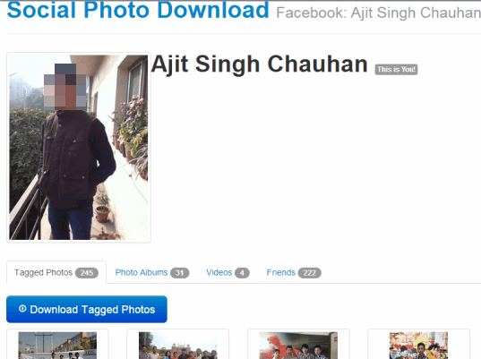Social Photo Download is an online Facebook application that is helpful to download Facebook photos and albums. What is the unique feature of this application that it lets you download tagged photos of your friends. Apart from this, it is able to download all your tagged photos in one go. Moreover, you can also explore all your photo albums, friends albums, and can download them one by one. Thus, instead of downloading whole lot of your albums, you can choose only required album(s) to download. It provides separate sections for tagged photos, photo albums, and friends. This makes it quite easy to use. For each album and tagged photos, preview facility is also provided by this application. A video section is also present to download Facebook videos, but this feature is not available at present.