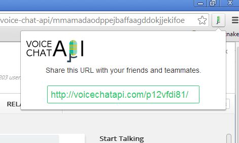The only thing that you’re gonna have to do in order to setup an audio chat room is click on the top right corner extension icon. Doing that will automatically generate a URL that you need to give to other people who you want to see participating in the chat. This means that Voice Chat API is also a group audio chat extension, not just audio chat extension.