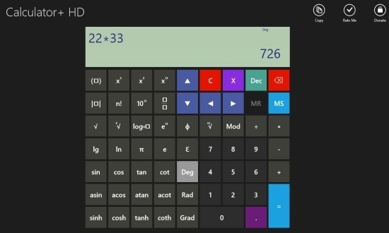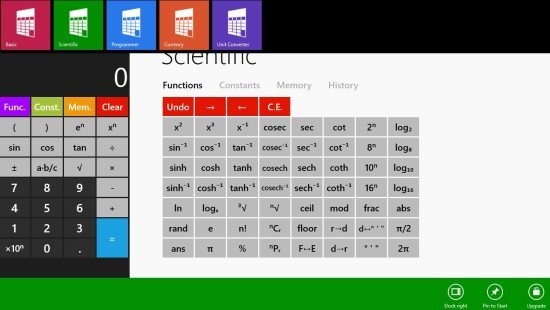 Calc4Win is a another free calculator app for Windows 8 that has a beautiful interface which allows you to do calculations on your Windows 8 device. The app displays and supports scientific function and constants. Another good thing about this app is that it divides the interface into two equal parts: one shows you the basic functions and options while the other one deals with the scientific functions.