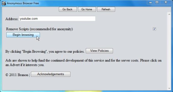Anonymous Browser Free is a free browser that lets you anonymously browse internet, leaving no traces of your identity on the web. It makes use of some proxy settings that changes your original IP address to some anonymous IP to hide your identity while surfing internet.