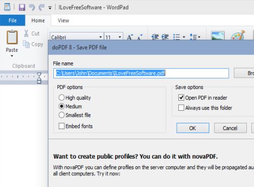 PDF document quality can be set (if you need smaller document) and you can choose if you want to use the fonts from the application (embedded fonts) or if you want doPDF to replace them. doPDF is a bit bigger (40MB), but it offers more features than CutePDF, so it’s justified.