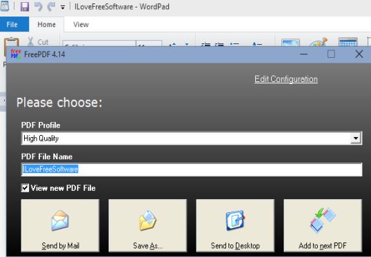 Here you can also setup the print quality, and choose what to do with the created PDF document. Files can be saved, sent via email as an attachment or sent to desktop. There’s also a setting for automatically opening the file after it’s printed.