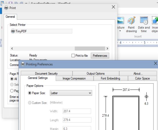 TinyPDF has a lot of options, even though it’s very small in size. Note that its settings are accessed by clicking on the “Preferences” button, on the printer selector page.
