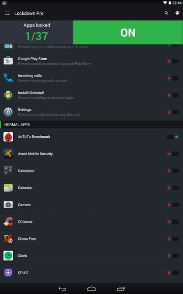 All the apps installed on your device are going to be listed once you run and setup Lockdown Pro. From the list of apps, protection on them can be easily turned off/on. Select top left corner setting to activate fake crash message.