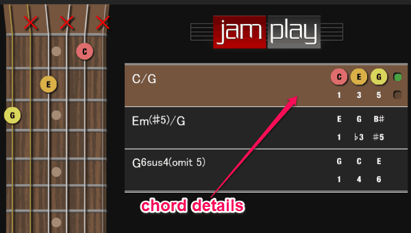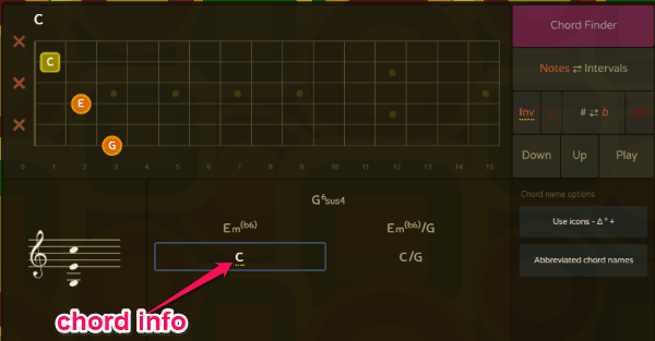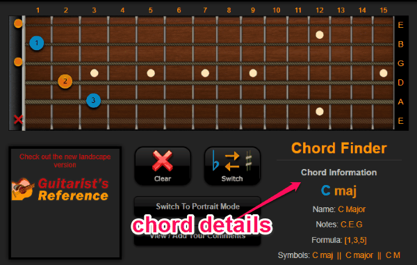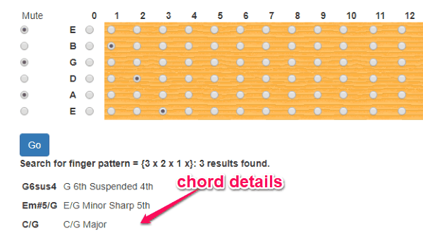 Chord Namer is quite similar to All Guitar Chords and allows you to find information of any guitar chord seamlessly. After you open it up, you can go ahead and add the notes on the virtual fretboard. You can simply click on the strings to do that. This reverse chord finder also has the option to mute strings or keep them open manually. Once done, hit the “Go” but\ton and then it will automatically generate the result for you. In the result, you will see the chord details like chord name, chord symbol, and all the other chords which can be created with the same notes.