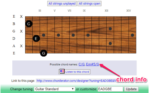 Chord Designer is one of the simplest reverse chord finder for guitar. You can easily use it to find chord information by entering notes on a virtual fretboard. After you go to the homepage of this website, you will see the fretboard where you can start entering the notes by clicking. Before that, you can also change the guitar tuning to Guitar Standard, Bass Guitar, 7-String Guitar, Guitar Open G, etc. It also lets you manually keep any string unplayed or open. Once you’re done with that, it will automatically create the chord details for you. You can see the name of the chord, symbol, and can also listen to the chord directly.