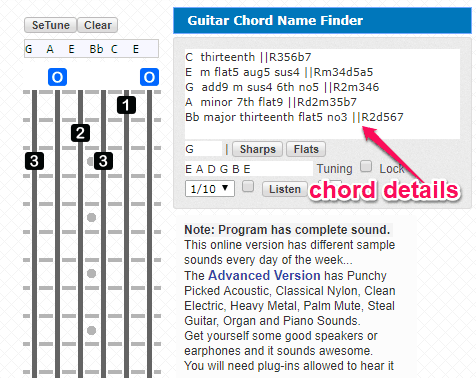 Gootar also comes with a free and simple online reverse guitar chord finder which can assist you to find out information on any guitar chord. For that, all you need to do is open this tool and then select the notes on the virtual guitar fretboard. After that, you can also enter a custom tuning, choose between Sharps or Flats, etc. Once done with that, it will show you the chord details on the right. You will see the name and symbol of all the chords which includes the notes selected by you. It also has an option to listen to the chord if you want.