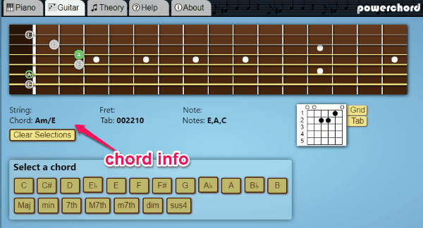Power Chord is another useful reverse guitar chord finder which can help you easily find out details about any guitar chord online. You can use it to find chord details as many times as you want for free. To do that, you would need to first go to the homepage and then start entering the notes on the fretboard. The virtual guitar fretboard will allow you to enter any note you want just by click on the frets. As soon as you do that, it will show you the chord information like the chord name, tab info, etc. It will also show the Tab and Grid diagram for the chord. Apart from that, you can also do the opposite and use it to see notes on the fretboard by selecting any chord from the table.