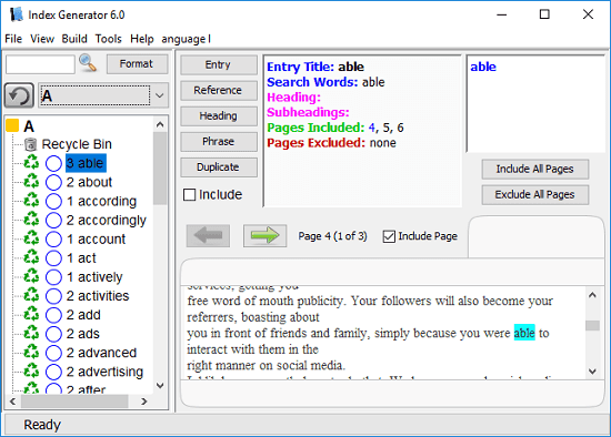 Index Generator is one of the best free PDF index generator software to add an index to PDF. This software supports multiple languages to build the PDF word index. It supports a variety of formats to export the words list and also it lets you selectively add the words in the final file. It automatically detects the language of the source PDF files and opens the stop word dictionary accordingly. Along with the list of words, it will show the preview of the page from the PDF file where that word occurs. You can choose all the words that you want to add in the index and then export them to a variety of formats.