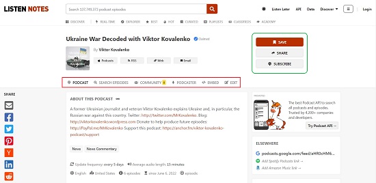 Clicking on any result gives more information about that Podcast, access to previous episodes etc. You can choose to Save, Share, Listen or Download the Podcast audio to your local disk all from the same page.
