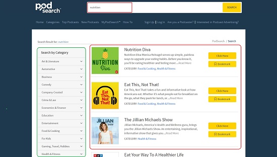 This is another good Podcast Search Engine which works similar to Google. Just type your search string and it will take you to the search results unlike the ones above where you need to choose some additional options or categories.