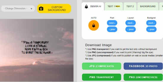 Also, set the alignment, opacity of text, width, height, line spacing-height, font style, etc. After that, you can download the image in PNG transparent, JPG compressed, Facebook 3D or PNG uncompressed.