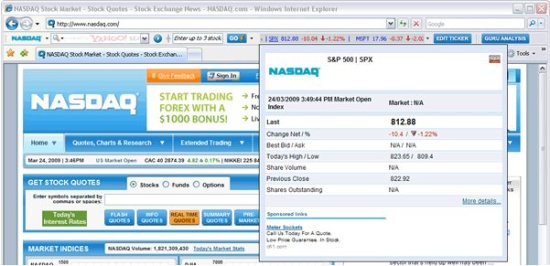 Nasdaq Stock Ticker is a freeware that gives you running report of the prices and trading volume of securities traded on the various stock exchanges. The app is free to download and you can easily obtain latest stock quotes and rates online with this free ticker tool. There is free stock ticker tool bar for your desktop where by all the stocks traded in the exchange are scrolled for your view and you can keep watch on your stocks. The free ticker toolbar features includes a one-click stock lookup and it auto-updates the prices in real time. The scrolling ticker bar will display you quotes all time no matter what window is open.