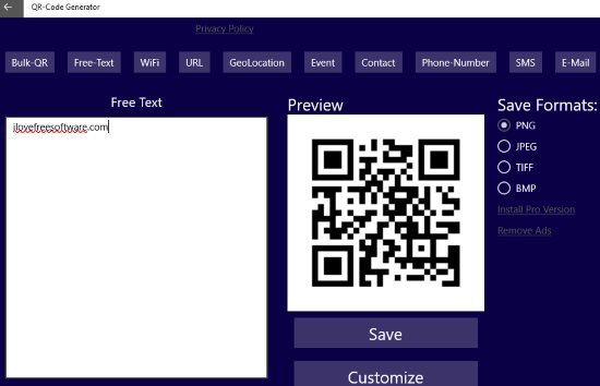 Simple QR Generator is a free QR code generator app. In this app you can only generate QR codes, as can be seen in the screenshot above. The app has a simple interface with lots of ads on it. In the given text box enter the text for which you want to generate a QR code. After entering the text click the generate button and your QR code will be generated. The save button on the right side will let you save the generated QR code on your computer in JPEG format. The ads in this app are quite distracting, but it does its work quite well.