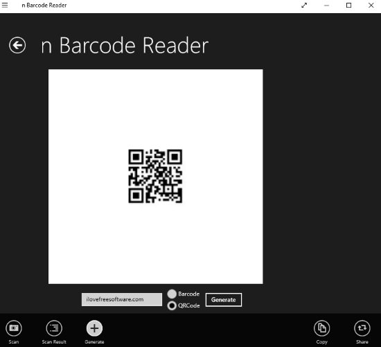 n Barcode Reader is a free barcode reader which can also generate QR codes. The app is mainly a barcode reader app and a scanning window will open up as soon as you start this app. You have to scroll to the bottom toolbar and select the generate option from there. Then you will be taken to the QR code making screen, which can be seen in the screenshot above. You have to select whether you want to generate a barcode or QR code. As we are only talking about QR codes so we will select that QR code box. Then we will enter the text that we want to include in the QR code. After writing the text down we will click the generate button. Clicking the button will generate the QR code in the white box given in the center of the screen. Now you can go ahead and copy this image and paste it into any app you want to. You can also share this QR code easily.