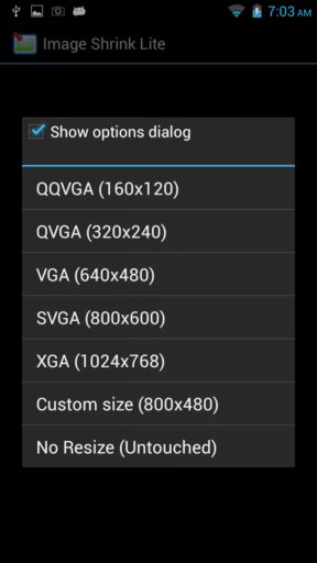 Size selection pops-up right away after you “share” the image to Image Shrink Lite. App itself can be opened up but only additional settings are available there. Things like output directory, quality, custom image size setup, etc.