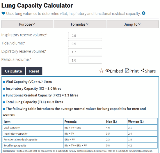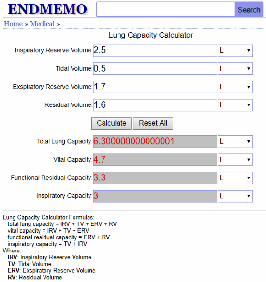 Lung Capacity Calculator from The Calculator is almost exactly the same as the calculator from MDApp. It provides output for all TLC, VC, IC, and FRC based on the input lung capacities. It only accepts input and provides output in liters.