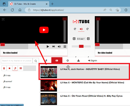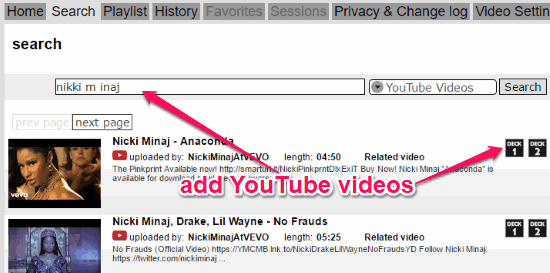 The YouTube integration this website has is quite amazing. You can easily search any song directly from YouTube without leaving the current tab and then simply drag it in one of the decks. There are two decks on the main interface and thus you can only play two songs at a time. Best part is that you don’t have to sign up in order to use this YT mixer.