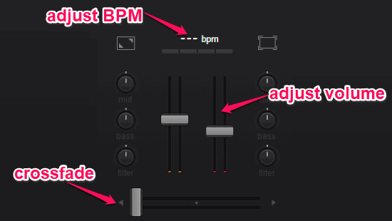 On the “Crossfade” section, you will also see tuners for mid, bass, and filter, but you can only use them for SoundCloud music tracks, similar to the audio effects.