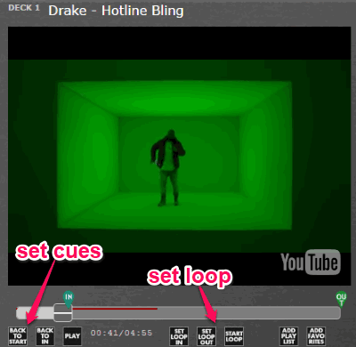 Step 2: In the same manner, you can search for any YouTube music videos and add them to both the decks. After adding a video to any of the decks, you will be able to set “Loop In”, “Loop Out”, and add cues by selecting the “Back to Start” and “Back to In”. Then, you can play the video by clicking the “Play” button at the bottom of the deck. Similarly, you can do the same for the other deck.