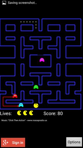 Controls are what’s interesting here. For example you can use the classic game controls where in order to move Pacman you need to tap on top, left, right, down arrows. Then there’s the control stick, where you just tap on the stick and slide your finger across the screen, but the one that’s really interesting are the G-sensor controls. That’s the one that you can see on the image above. You tilt your device in order to direct Pacman away from the ghosts, it’s very fun.