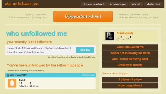 who.unfollowed.me is a handy service that uses a straight approach to track and show your follower history instead of relying upon email or messaging to inform you who have stopped following you on Twitter. All you have to do is to sign up for free with the service using your Twitter login credentials and then press the “who unfollowed me” button. The service will produce immediate results right in front of you and also lets you tweet about your unfollowers if you want.