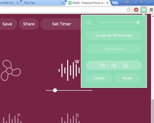 In a way it adds on top of what the recently mentioned white noise extensions are offering, because it has a nice modern looking interface and the process of creating personalized sounds has also been simplified. Here you create relaxing sound profiles. It can be white noise, white and brown noise mixed together, it can be just the rain or rain + thunder etc. Extension adds a top right corner control panel for controlling everything from inside Chrome. You need to register an account with Noisli to use this white noise extension.