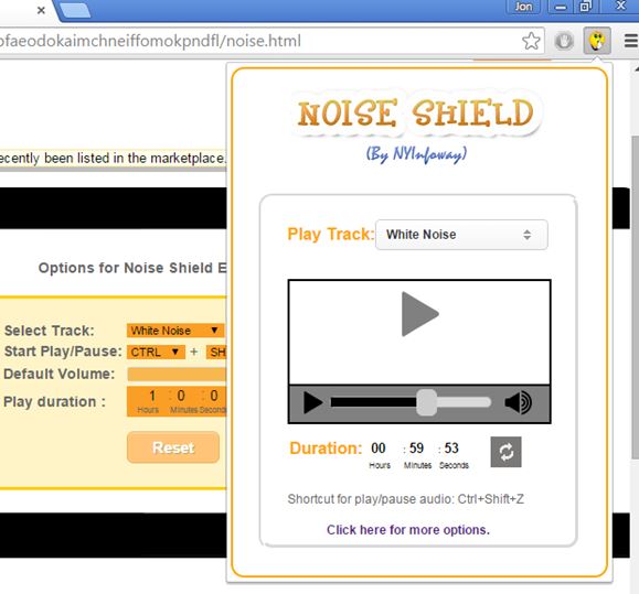 Extension has a top right corner control panel for selecting the sound type and controlling playback. Open up extension settings for tweaking the length of the default session, which is 1 hour. Click play and let the extension do its thing in the background.
