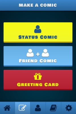 The first icon is obiviously the home screen. The second icon with a pencil lets you create a new status for yourself, a new comic strip with you and your friends, or a new greeting card. The third icon with a person on it lets you edit the avatar you created for yourself. The fourth icon with a book shows you archives, which has two options you can browse through; comics created by friends or comics created by you. The fifth icon is for settings, where you can turn push notifications on or off, log out of the app, or reset you avatar.