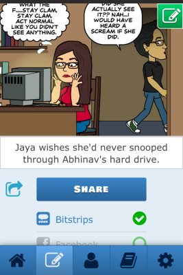 Once you are done creating a comic strip click on the share button on the bottom. This will give you two option share it on Bitstrip and Facebook or you can choose only one of them. Then go ahead and post it to share it with your friend and have a good laugh.