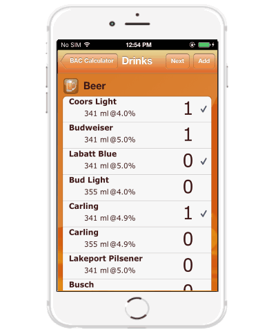 Step 3: Once you’re done selecting the beverages, simply hit the “Next” button and this app will calculate and give an estimate of your BAC level. Additionally, it will also show the behavioral and impairment symptoms which might occur to you based on your BAC.
