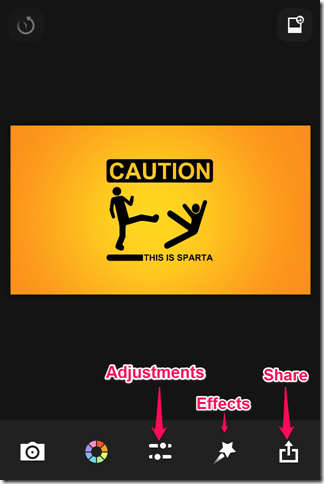 The app even lets you add various effects to the photos that are on your device. To do this, tap on cross icon while the camera is open. A new window will open. Now, tap on camera icon at extreme left, followed by a tap on the icon at the right side of the new screen. Select the photo which you want to use. Here, you will see the image and 5 options at the bottom of the screen.