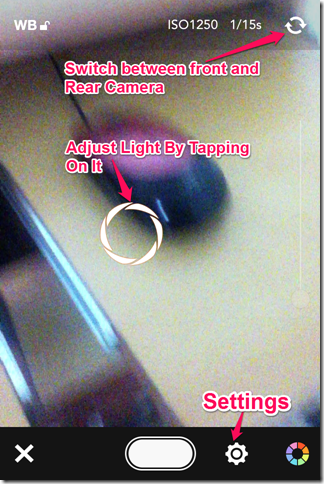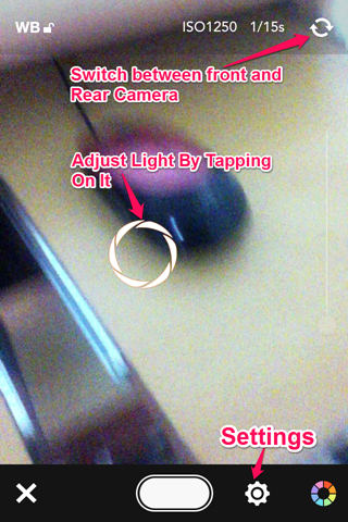 You can download the Rookie-Photo Editor app either by searching on the iTunes App Store or by clicking on the link given at the end of this review. When you will launch the app, it will automatically open up your iPhone’s camera. Here, You will see many tools and effects around the screen which will help you in clicking the right picture in real time. All the options are placed under Settings option which can be accessed by tapping on the gear shaped icon at the bottom side of the screen.