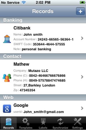 Mutazo-Password Manager is yet another app for managing confidential info such as passwords, credit card details and other important information. Advanced synchronization capabilities ensure that you will always have up-to-date confidential information available through your iPhone.