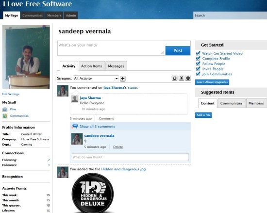 The homepage also called as My Page will open as soon as you login to your account. The homepage contains all the activity of members and groups. In this homepage you can post files, updates, and comment to your colleagues updates. You also have the option to send message to certain employees privately through the message option available.