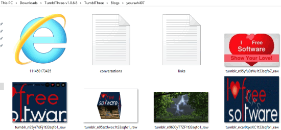 Getting started with TumbleThree is pretty easy; download and install it from the link provided at the end and then open it. You will then see its main interface as shown in the main screenshot above. Now, in order to download a Tumblr blog, simply specify its URL in the URL box and then hit the “Crawl” button, as shown below. After that, it will begin downloading all resources of that Tumblr blog i.e. images, videos, etc. Do note that it will extract all the links, conversations, and question posts in separate text files. The screenshot below displays all the downloaded images, videos, etc. from ilovefreesoftware Tumblr test blog.