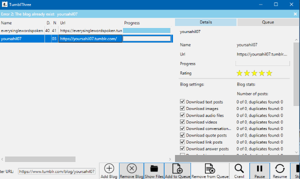 TumbleThree is a free software to download Tumblr blogs. This free software can also be used as a Tumblr backup software as it can download all videos, images, links, conversation posts, etc. from any Tumblr blog. Also, you can choose which data from a Tumblr post you want to extract. So, if you just want to download images from a Tumblr blog then it can prove to be handy. It extracts links, conversation, reblogged posts, etc. in separate TXT files.