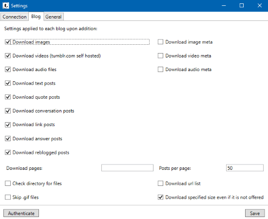 By default, it saves all the Tumblr blog data in the “Blogs” directory, which can be found in its extracted archive file. You can also change this download directory from its preferences. As I mentioned, it can download images, videos, GIFs, conversations, etc. from a Tumblr blog but you can specifically choose whether you just want to download all images, videos, link posts, etc. from a Tumblr blog, as you can see in the screenshot below.