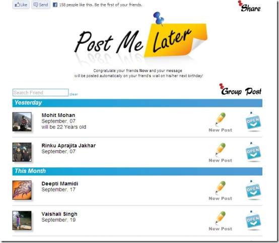 Apart from single message, Post Me Later offers you to optionally send one similar message to a group of friends. For this you need to press “Group Post” given at the top-right side of the page. Thereafter, select the friends from the list. Click on “Send”. Its done!!