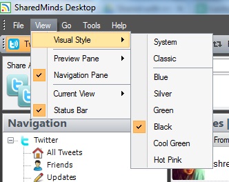 - Main Menu: It is used to access all the menus (file menu, view menu, tools menu etc.) so that you can add Twitter accounts, show/hide the status bar, navigation pane, preview pane, change theme of SharedMinds Desktop, export tweets list as xls, xml, txt, or csv file, and to access a particular item available in the navigation pane.