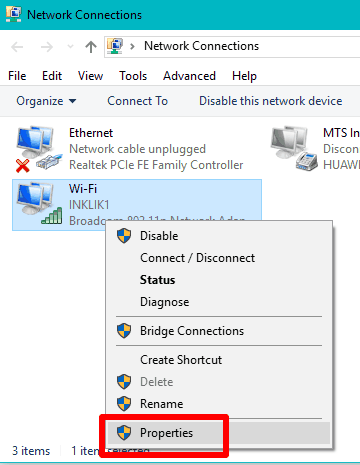Step 2: After opening the Network Connections window, you need to select Ethernet or Wi-Fi (depends on the connection you are using). Right-click on the selected option and then click on Properties.