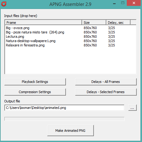 APNG Assembler is a free software to generate animated PNG file from still PNG and TGA images. You can add multiple supported images on its interface and quickly create APNG file which you can use wherever you want. For every single input image, you can also set the time delay that makes it more interesting. You can set time (in seconds) when the next image will appear after the current frame while playing your APNG image.