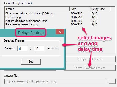 Step 3: After adding the images, it’s your choice whether you want to manually set delay time (in seconds) for input images or want to keep the default delay time. To add delay time for a particular image or multiple images, just select the image(s), and click on Delays – Selected Frames button. It will open a small box, like visible in the screenshot below.