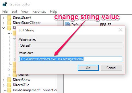 Step 3: As soon as the “command” sub-key is created, you need to change the string value of the sub-key. To do this, double-click on the “Default” string value on the right and paste the value “C:\Windows\explorer.exe” Your System Setting URI. For example, if you’re creating a shortcut for “Display Settings”, then paste the value “C:\Windows\explorer.exe” ms-settings:display in the input field where it says “Value Data” and click “OK”. (you can get the URI corresponding to different settings from this link).