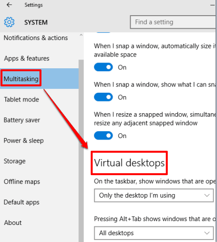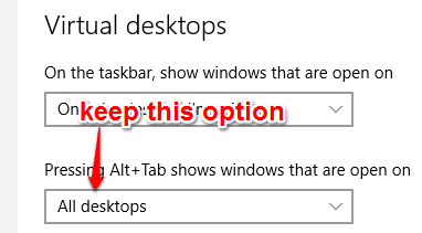 Step 3: Virtual desktops section contains the option to set Alt+Tab action. By default, pressing Alt+Tab shows windows that are opened in the current desktop. You need to “change it to All desktops“.