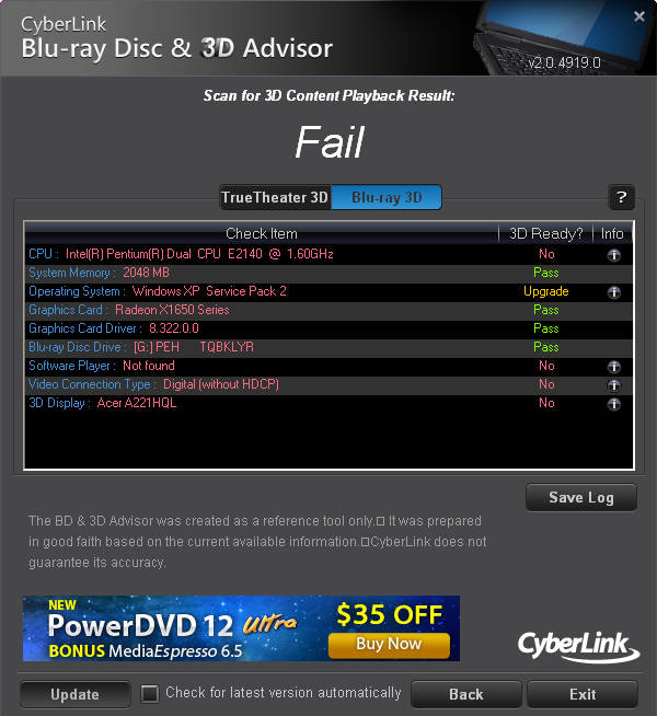 Test is started the same way that the Blu-Ray test is started, and at the end you are presented with the same type of report. The program here tests hardware, and also it checks to see if your monitor supports 3D display. My computer failed here as well, even though I have a decent 21.5″ monitor, it doesn’t support 3D image and I failed the test.